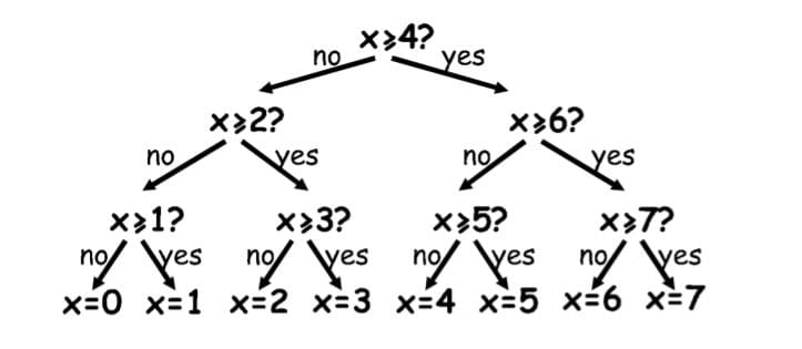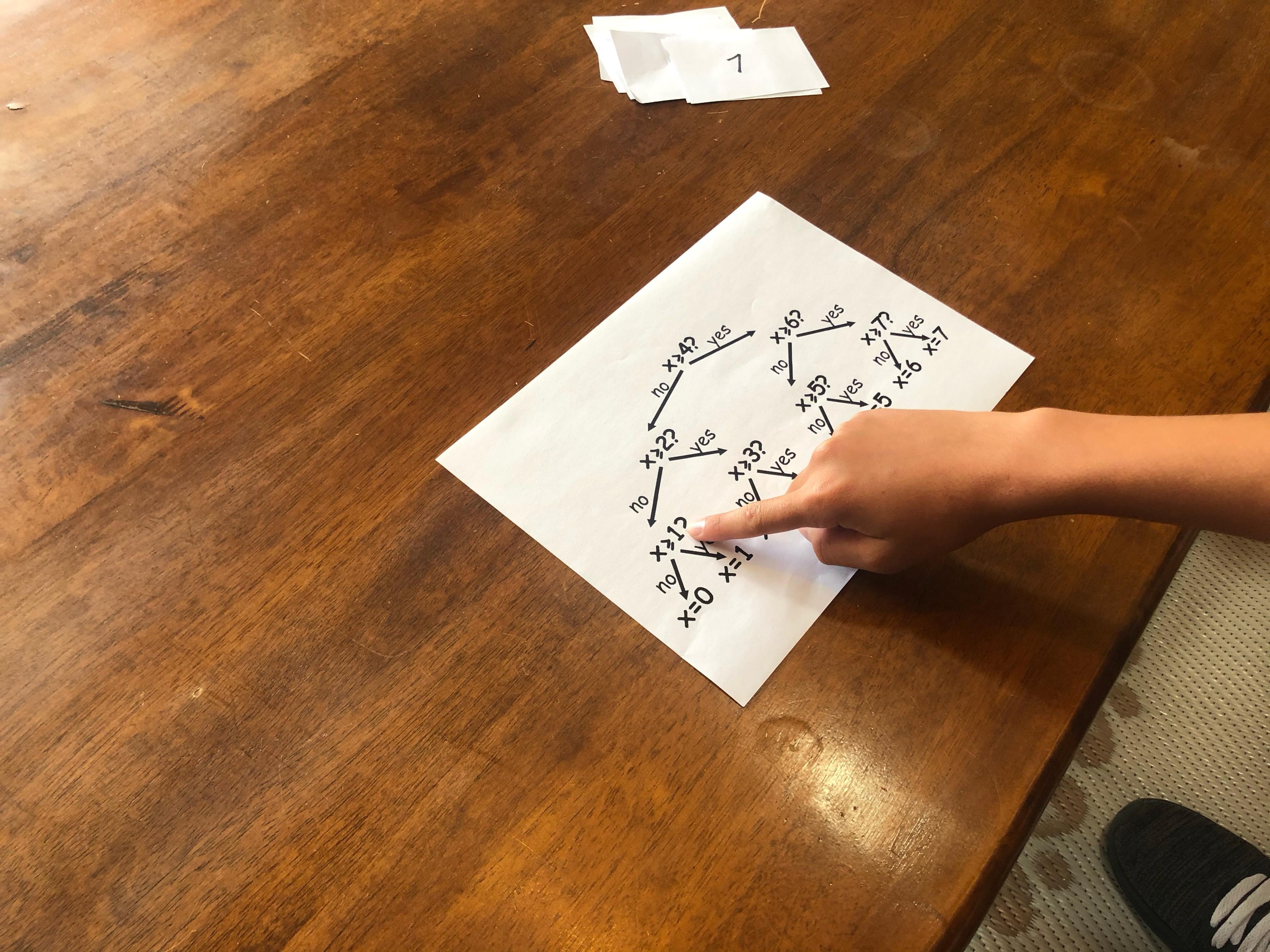 Here’s a chart that will help you to ask questions. I’m thinking of a new number from 0 to 7. Start at the top, and follow the "yes" or "no" line as I answer each question.