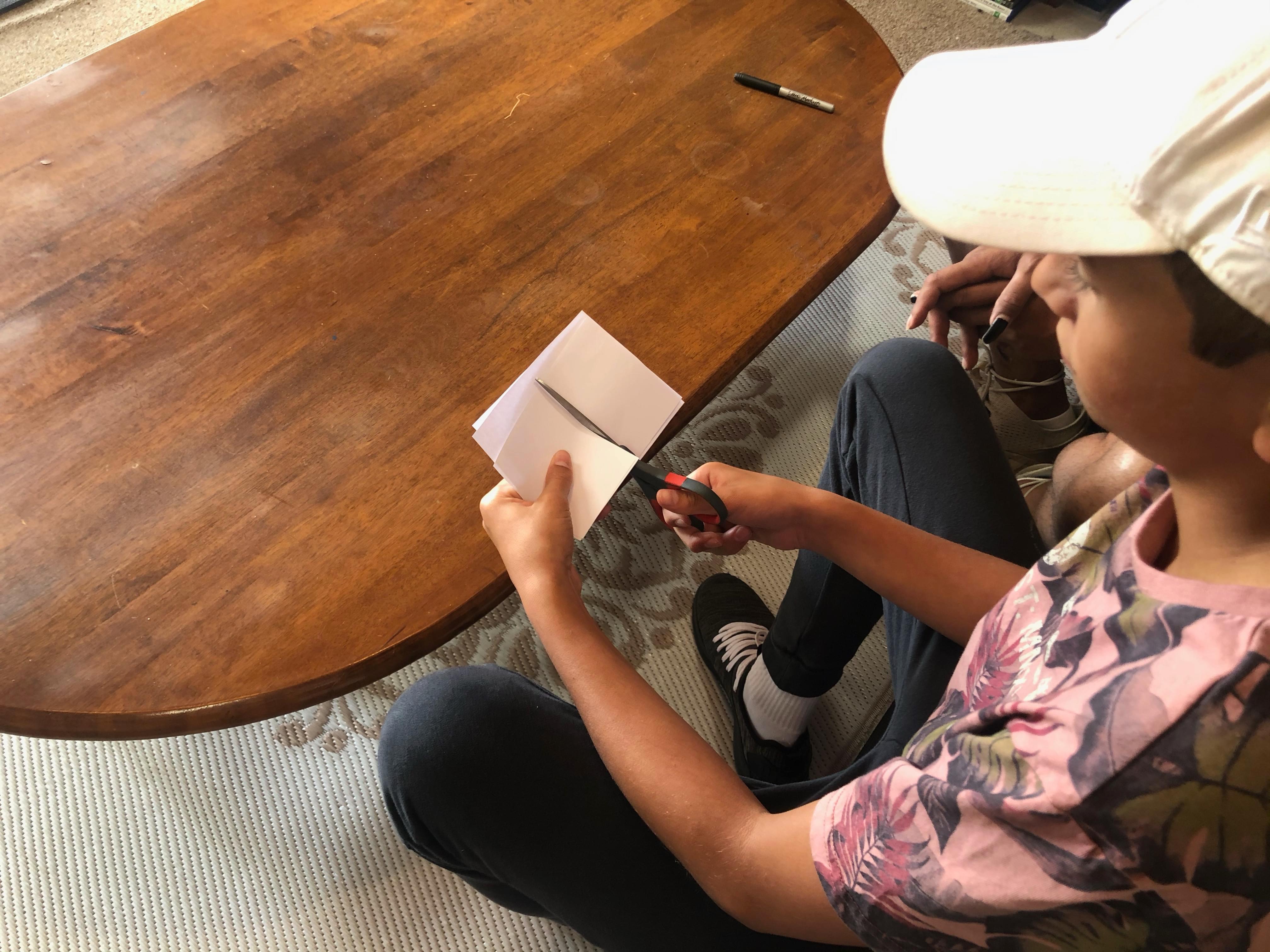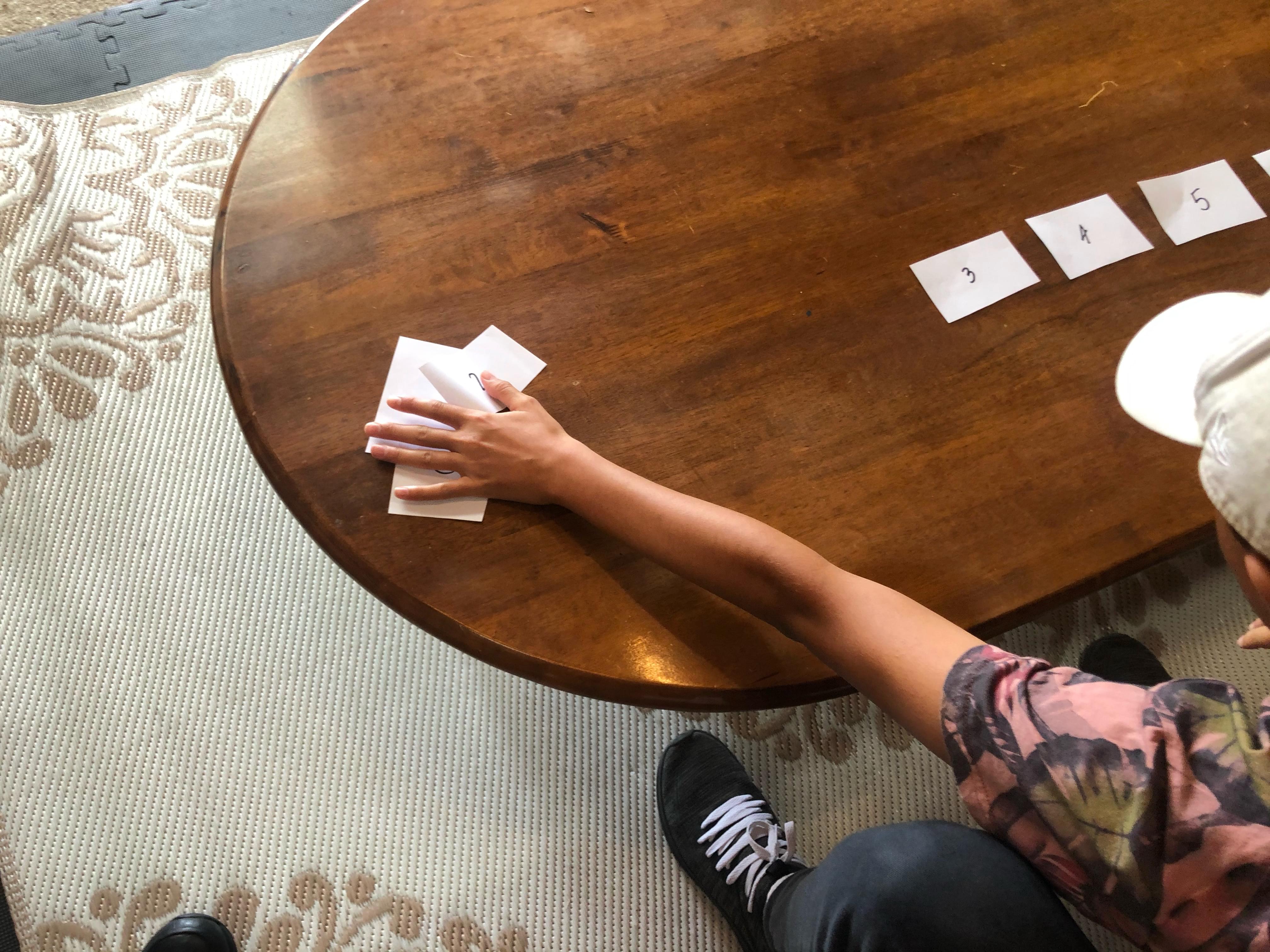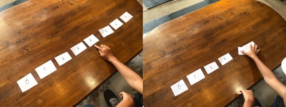 If your secret number is greater than or equal to their choice (as in the photo), the child can move all smaller cards to one side, to show how it is narrowed down (ideally the child can work out which cards can be eliminated; they need to be careful to be accurate!) If their guess is not greater than or equal (i.e. is smaller), they can eliminate the card with their guess and all larger cards.