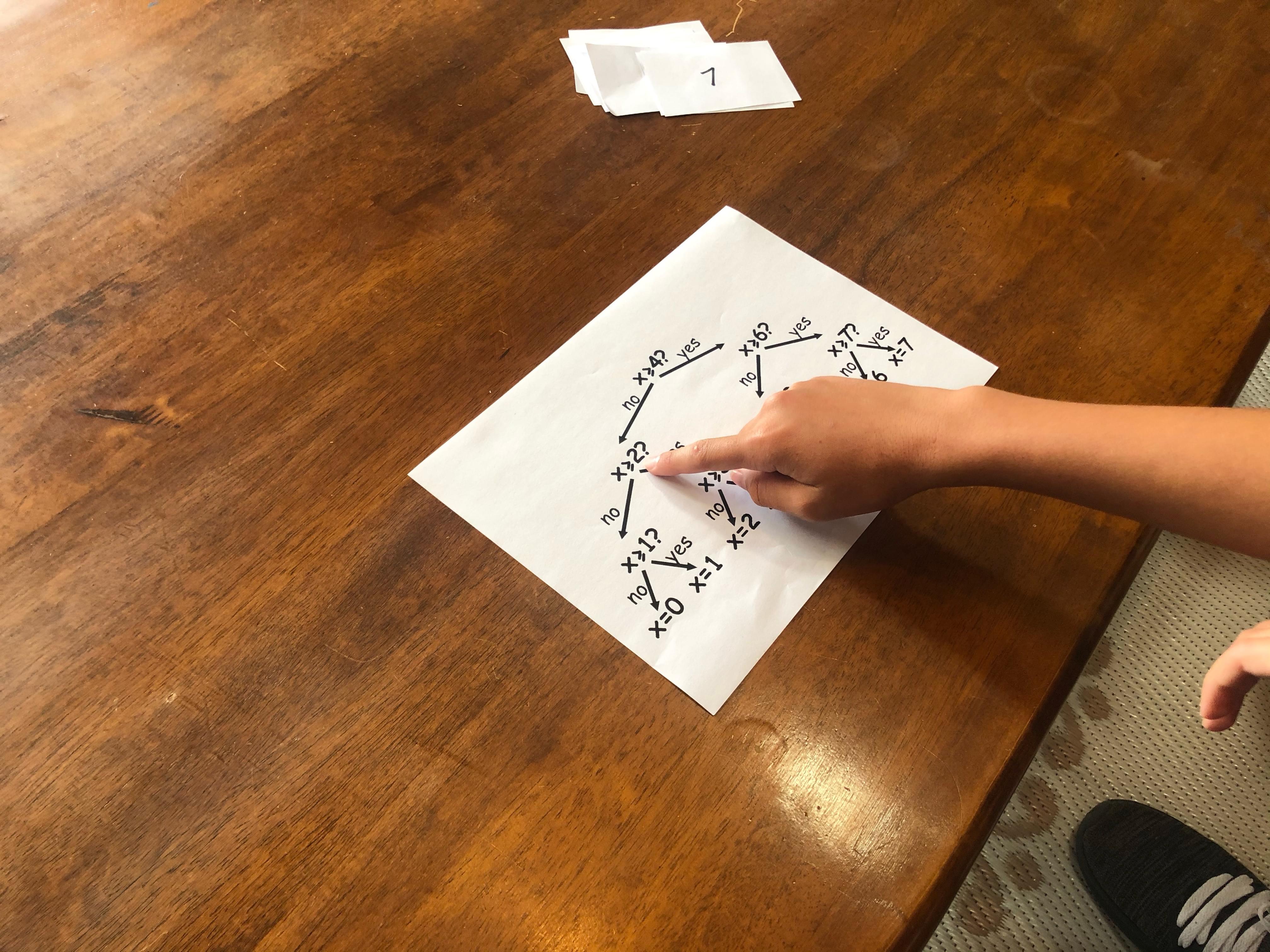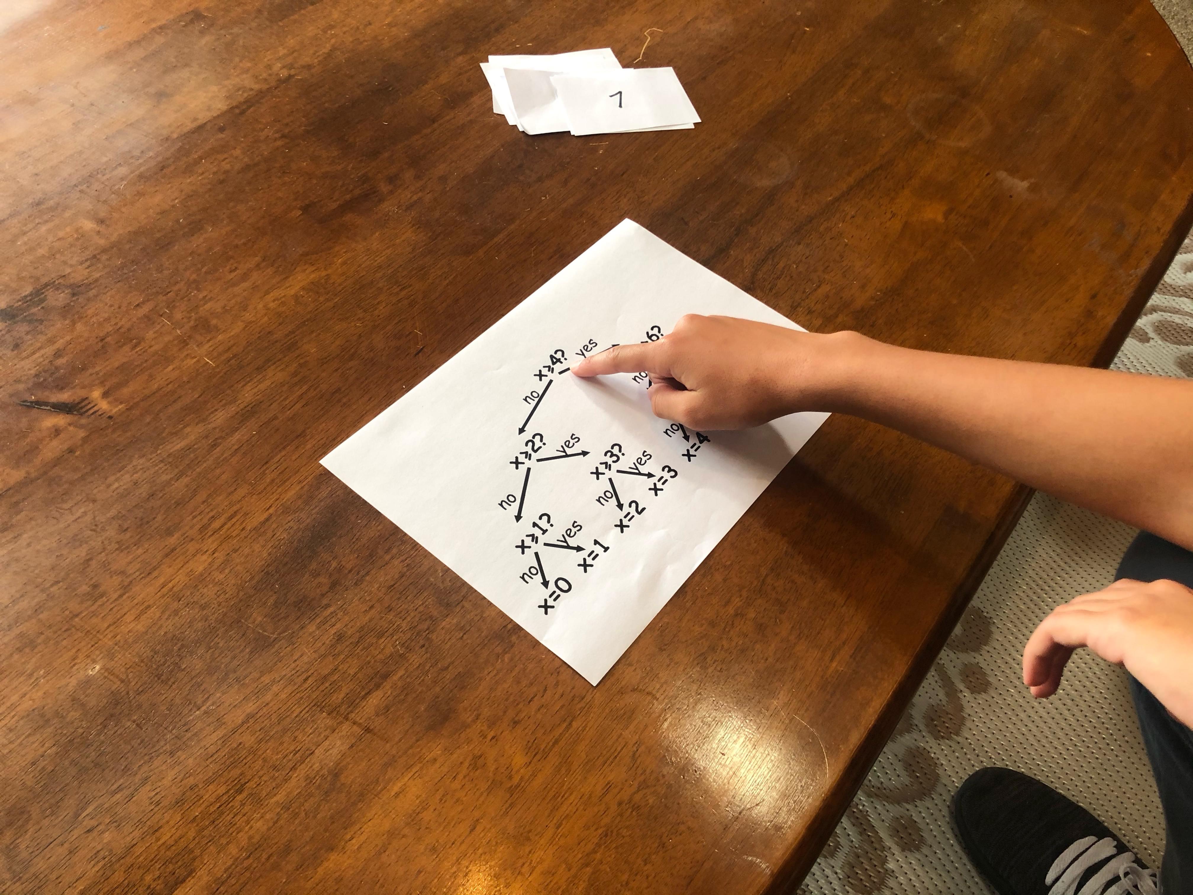 The child might recognise this as being the same strategy they have learned just before. Guide them to ask if your number is greater than or equal to 4 first, and then follow either the "yes" or "no" branch down the chart.