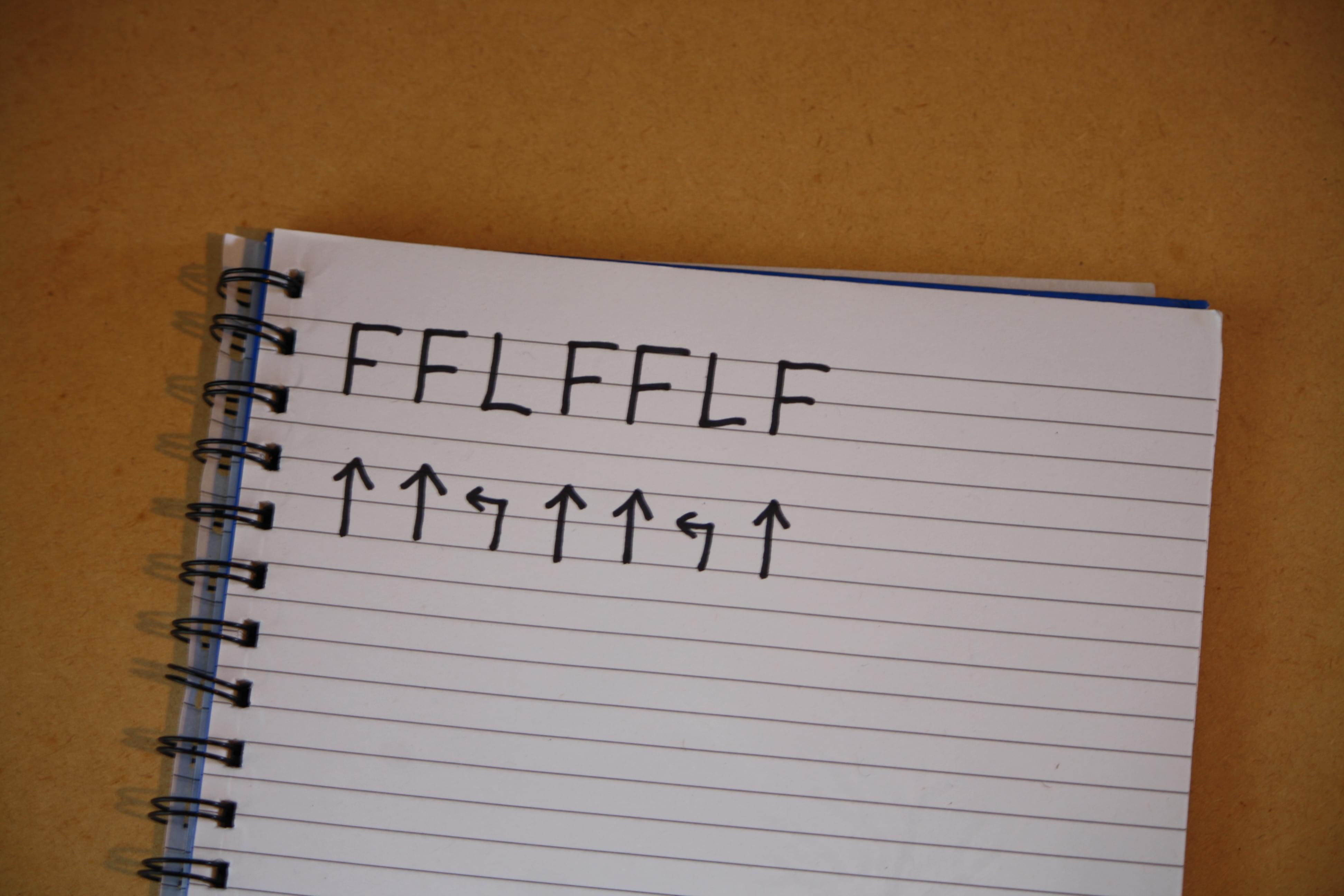 Decide what symbols you will use to write the instructions (what “programming language” you will use). We suggest arrows (↑, ↰, ↱) or letters such as ‘F’ for ‘forward’, ‘L’ for ‘turn left’.