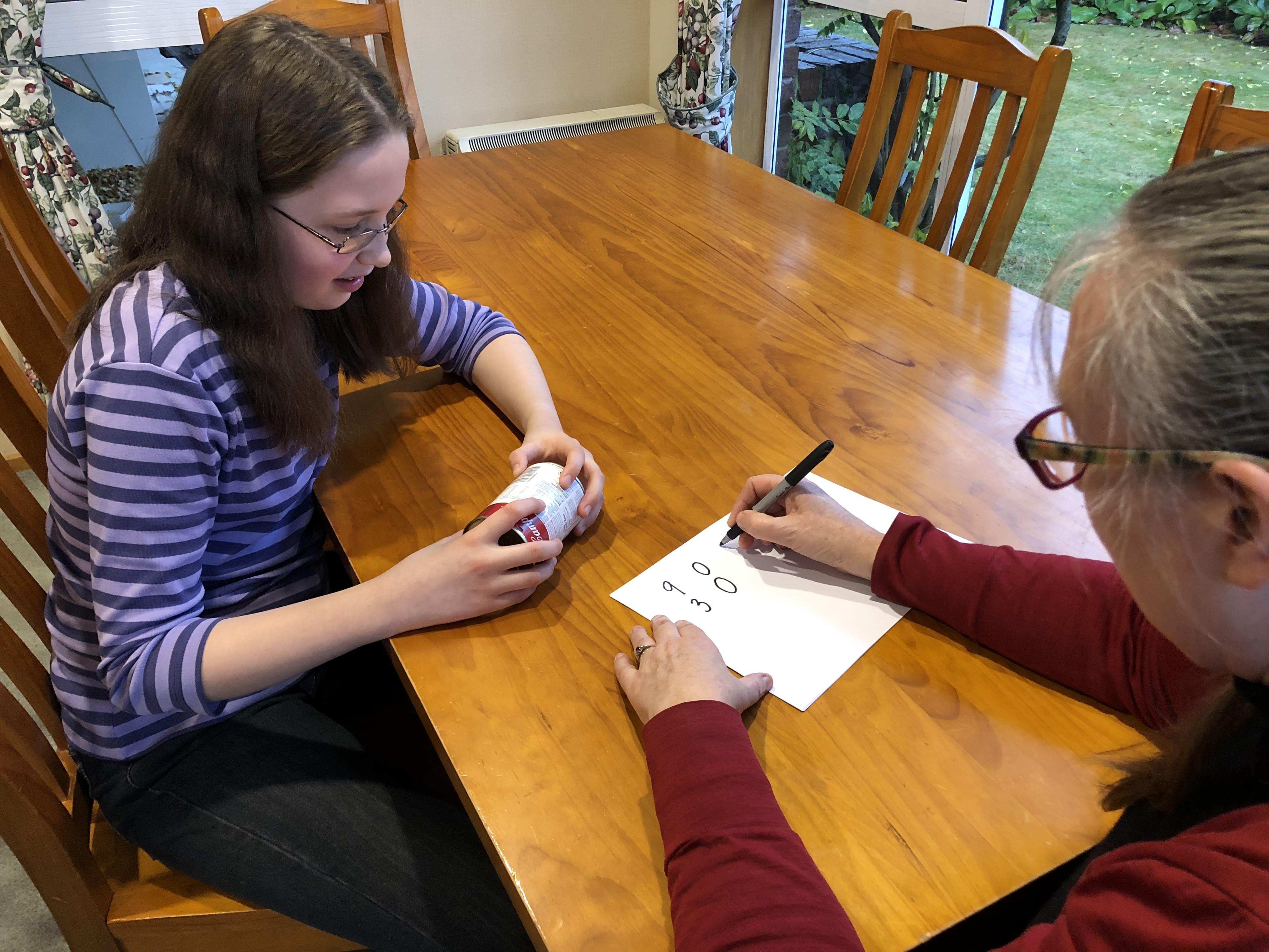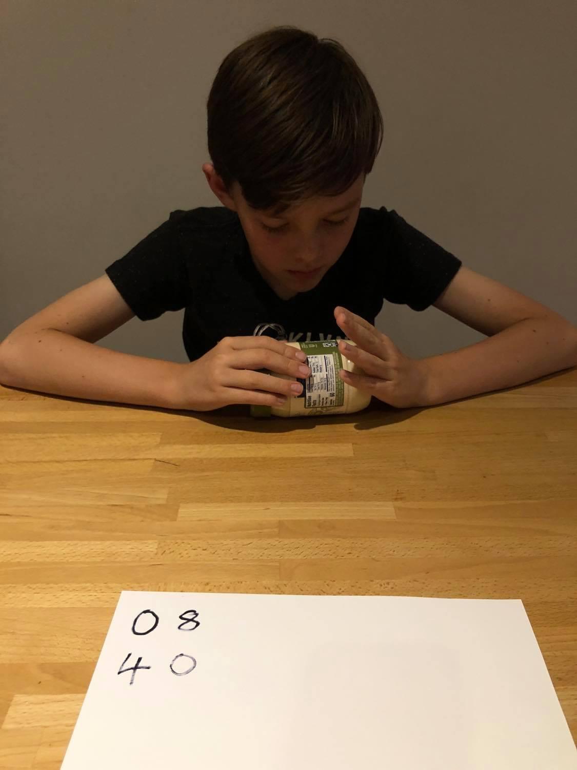 Continue writing the digits on alternating lines; as you get to the 11th digit (6th digit on the first row), remind them to not read the last one. There will be 6 digits on the first line, and 5 digits on the second line. The digits shown here are for the product code 0 4800120802 5.