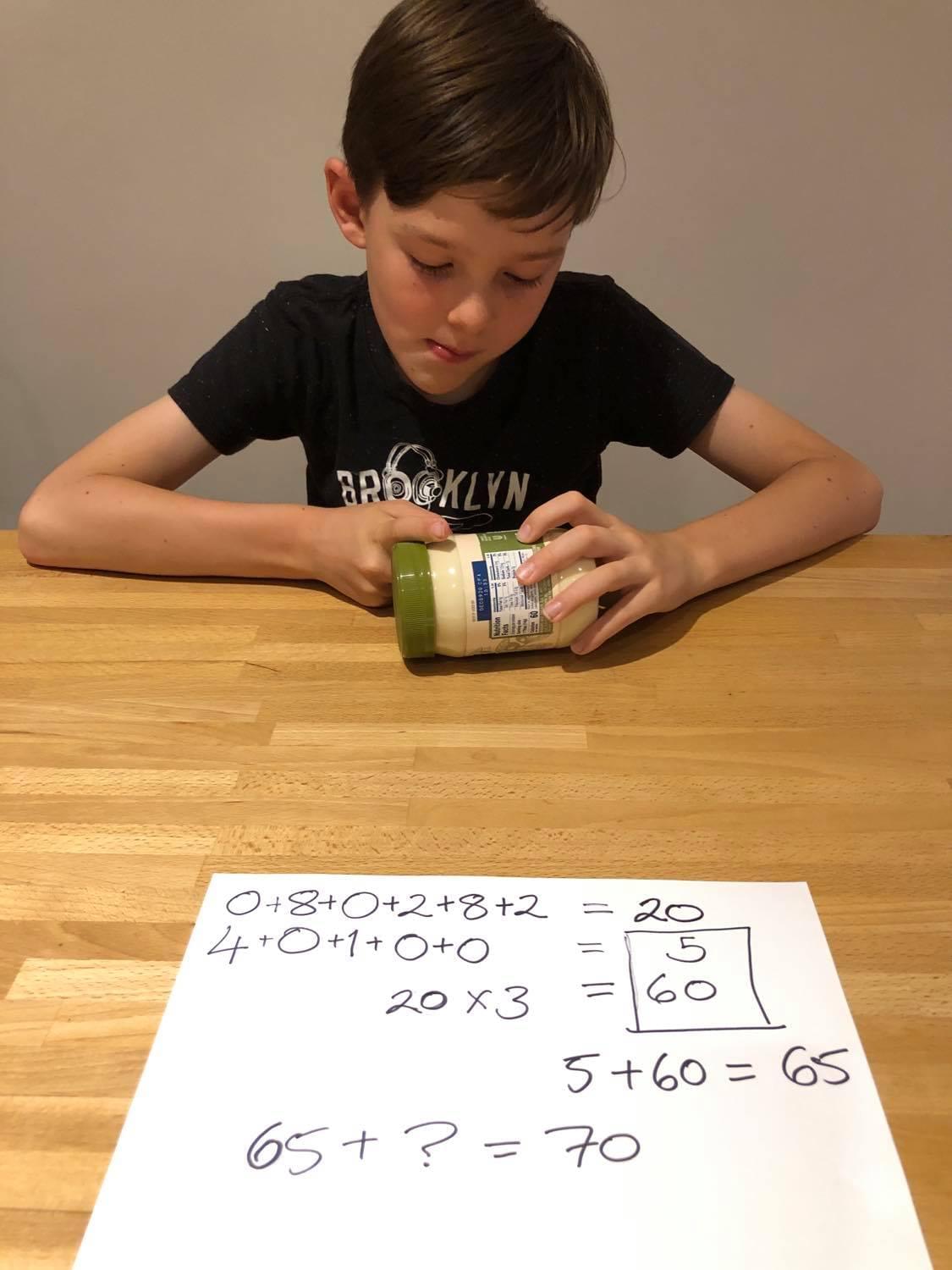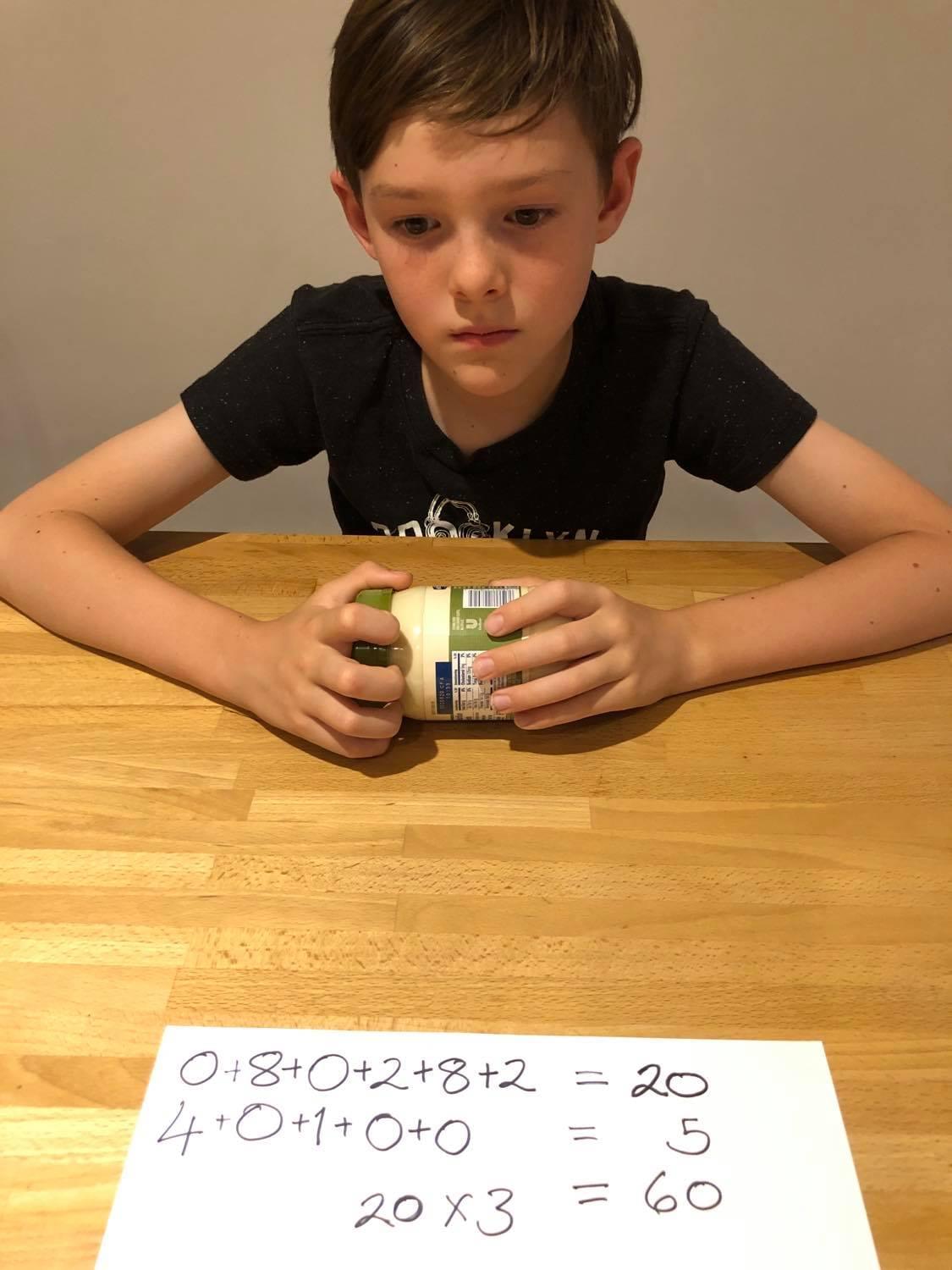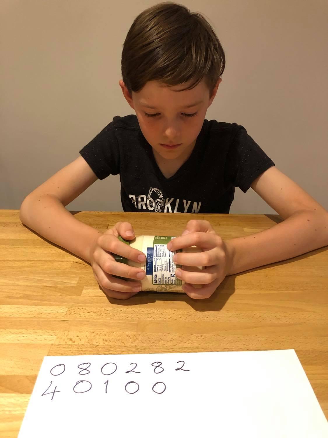 Write the digits on two lines, putting every second digit on the other line. The example here is for the 12-digit product shown above (the child should read 0 48001 20802 for that example).