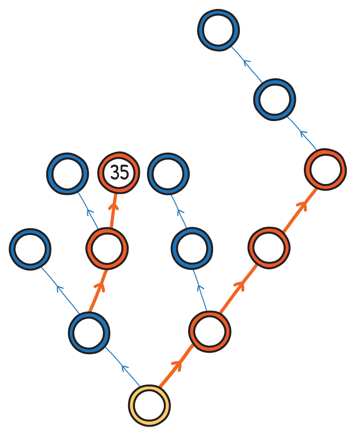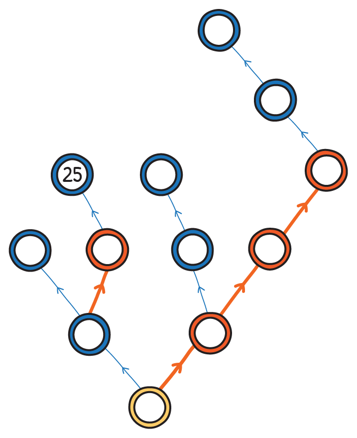 Turn the first disc back over (so that students don't easily remember what was on it), and follow the left branch, revealing the number under the next disc.