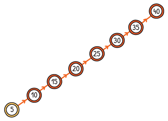 For example, below is a tree where we've added the numbers 5, 10, 15 and so on; as a result, every branch is a right branch.