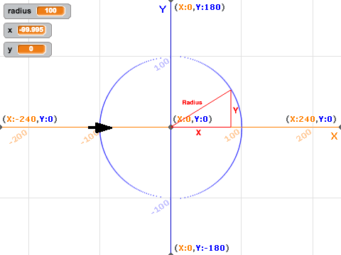 Write a program that draws a circle, with the given centre point x:0, y:0, and its radius equal to 100 steps. You can use the same method as the "Draw a 360-sided polygon" challenge, but this time you will need to work out how long each side is based on the circumference of the circle, and you'll need to work out the circumference from the radius.