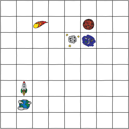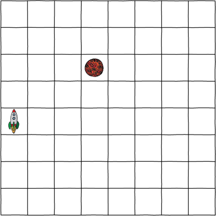In this example the rocket should be in the square three to the left of Mars.