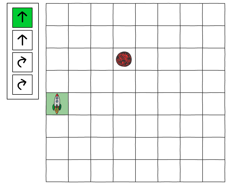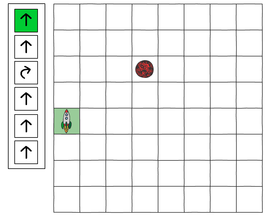 To work it out students may initially need to see the program in action, so place the arrows within the grid to demonstrate what the rocket will do.