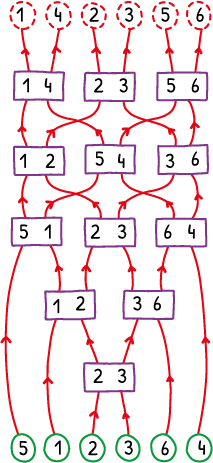 Show the students the Sorting Network again (if the network needs redrawing then students often enjoy doing this, and drawing it accurately from the diagram is a useful exercise).