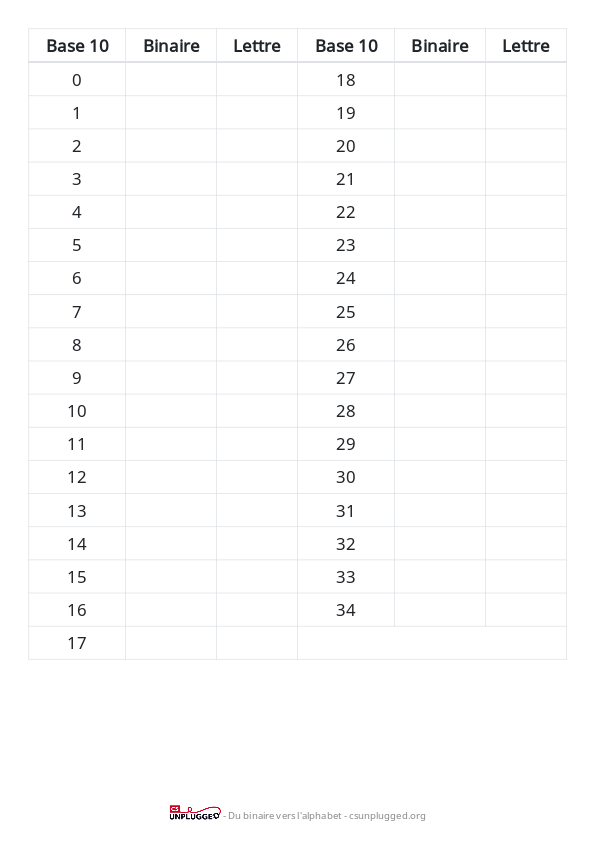 Demandez aux élèves de créer des instructions pour la conversion d'une lettre dans un nombre décimal (avec ou sans la table) ou d'en faire une démonstration, puis de convertir un nombre décimal en binaire ; sont-ils en mesure de trouver une solution valable pour tous les cas ? Peuvent-ils expliciter ce qu'ils font à chaque étape et pourquoi ?
