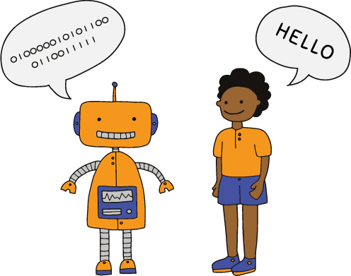Cette activité est particulièrement pertinente concernant l'abstraction, puisque nous représentons du texte écrit avec un simple nombre, et ce nombre peut être représenté à l'aide de chiffres binaires, qui, comme nous le savons depuis la leçon 1, sont une abstraction de l'électronique physique et des circuits à l'intérieur d'un ordinateur. Nous pourrions également élargir notre abstraction parce que nous pourrions utiliser deux symboles autres que des 0 et des 1 pour représenter notre message (bien que nous vous recommandons de rester sur les 1 et les 0 pour les élèves qui voient cette notion pour la première fois). Par exemple, vous pourriez représenter votre message par le clignotement d'une lampe torche (ce qui donne une idée de la façon dont les informations peuvent être envoyées sur un câble à fibre optique !), ou par le tracé d'une ligne de carrés et de triangles sur le tableau blanc.