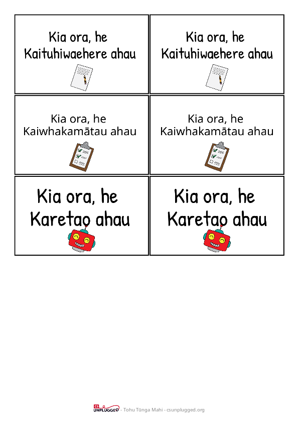 "Ko te mahi mā tātou, ko te tuhi i ngā tohutohu kia mārama ki te Karetao, ki a (kōrerotia te ingoa o te ākonga). Ko (te ingoa o tētahi ākonga) te Kaiwhakamātau, māna ngā tohutohu e tuku ki te Karetao. Kia mataara te Kaiwhakamātau ki ngā hapa."